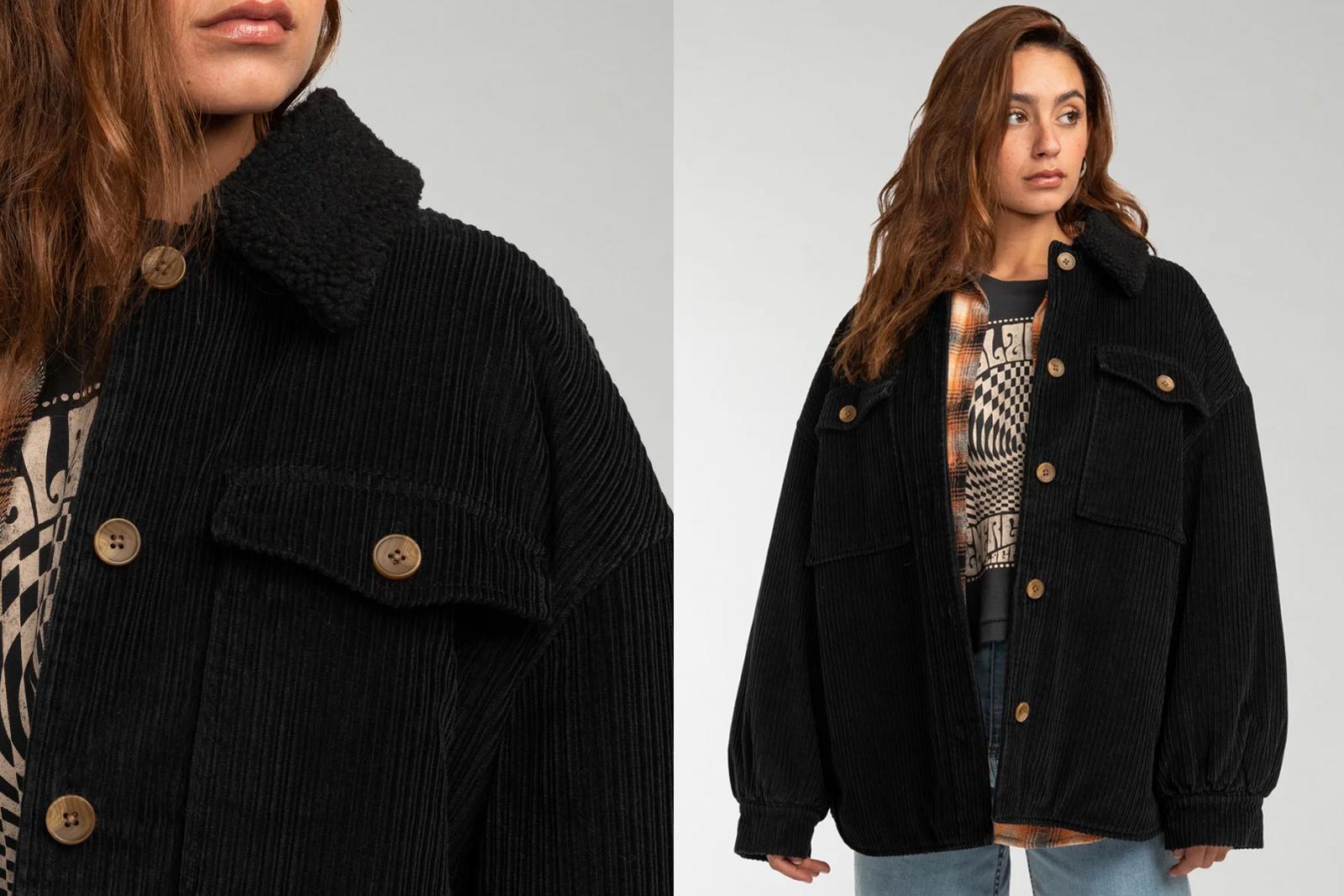 Женская модель Lucky Cord сделана из нежной вельветовой ткани и дополнена воротником из шерпы, плюс оверсайз фит – если захотите утеплиться и надеть под куртку худи, свитер или рубашку.