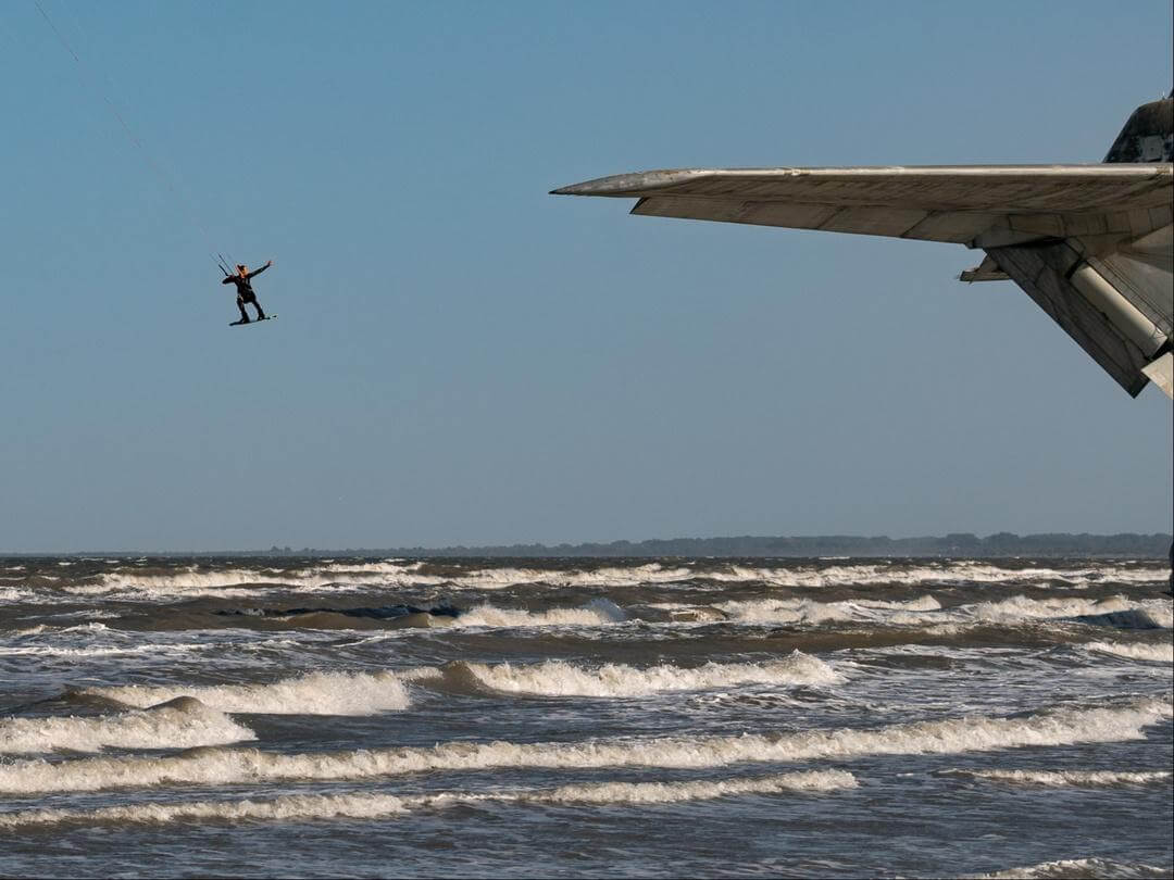 Конечно, я очень хотел перепрыгнуть через экраноплан. Ветер был достаточно сильный для этого, около 15-17 м/с. Весь день я катался на 9-метровом кайте и лишь под вечер взял 11-метровый купол. Однако маленький раздражающий чоп, огромный размах крыльев поперек разгона и сильные завихрения потоков ветра на приближении к точке прыжка, не позволили мне этого сделать.