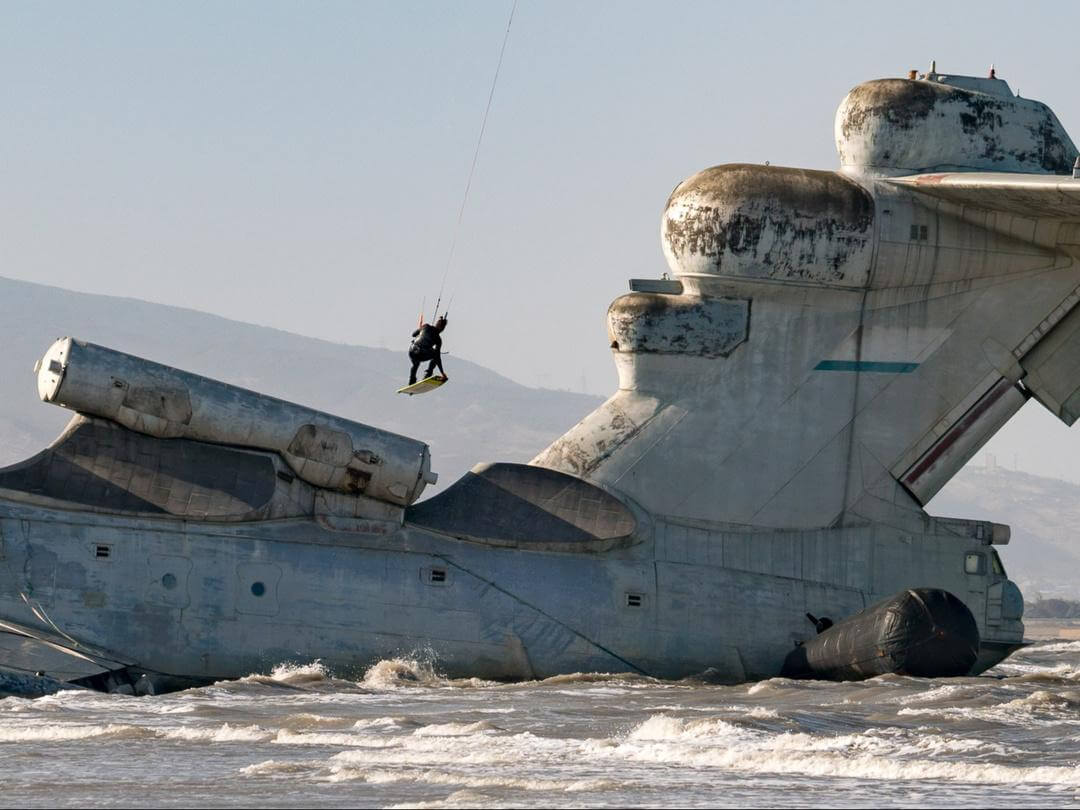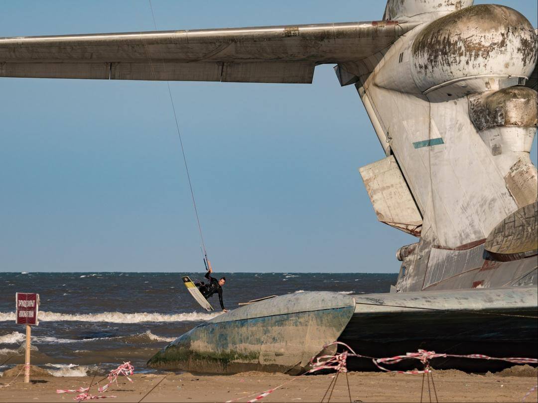 Однако нам это было только на руку, и мы приехали в самый подходящий момент. Я обожаю кататься в неизведанных и необычных для кайтинга местах, и это был джекпот! На протяжении всего дня я катался как можно ближе к этому единственному в мире ракетному экраноплану. Его размеры просто поражают: высота 19 метров, а длина строп всего 22м, то есть кайт едва-едва возвышается над его задним крылом. За счет этого можно было легко проезжать под ним прямо вместе с кайтом — невероятное ощущение. В эти моменты ты максимально ощущаешь всю мощь этой махины из СССР.