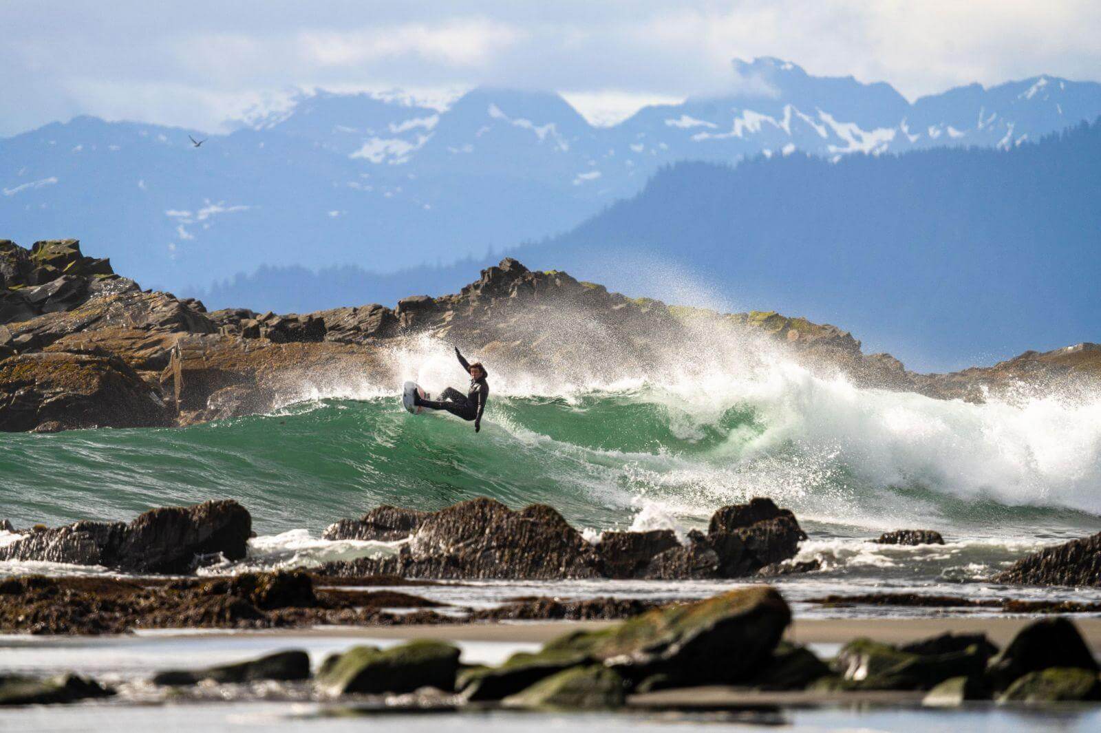 “Волны были почти такими же неуловимыми, как и солнце в этом трипе – и именно это сделало эту сессию такой особенной. Это был риф и мощная волна, пришедшая с 20-футовым приливом. Когда тучи разошлись, и мы смогли увидеть горы, потом горы, находящиеся ещё дальше, казалось, что этой глубине нет предела… слой за слоем. Цвета, которые получаешь в этих местах, вместе с таким потрясающим фоном – именно поэтому фотографировать там такое удовольствие. Через несколько секунд после этого фото белоголовый орлан влетел прямо в кадр – я был на берегу и просто открыл рот от удивления. Это был восторг.”