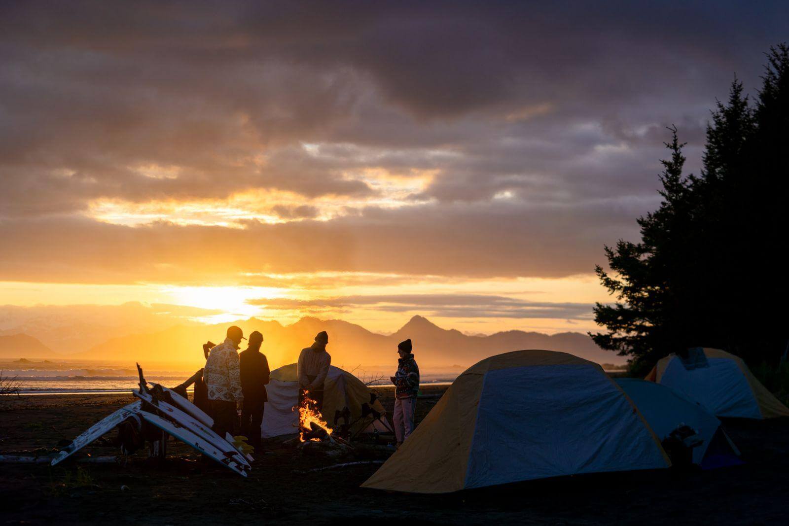 “11 вечера в нашем лагере на острове Монтагью. В основном, там было мокро, сыро и в целом кемпинг у устья этой реки был мрачноватый. Мы всё время боялись медведей. Ещё одна причина поддерживать огонь. Но был просвет с просто нереальным закатом. Хорошее напоминание для всех нас – если тебе не нравится погода на Аляске, просто подожди 10 минут. Это место может измениться так быстро.”