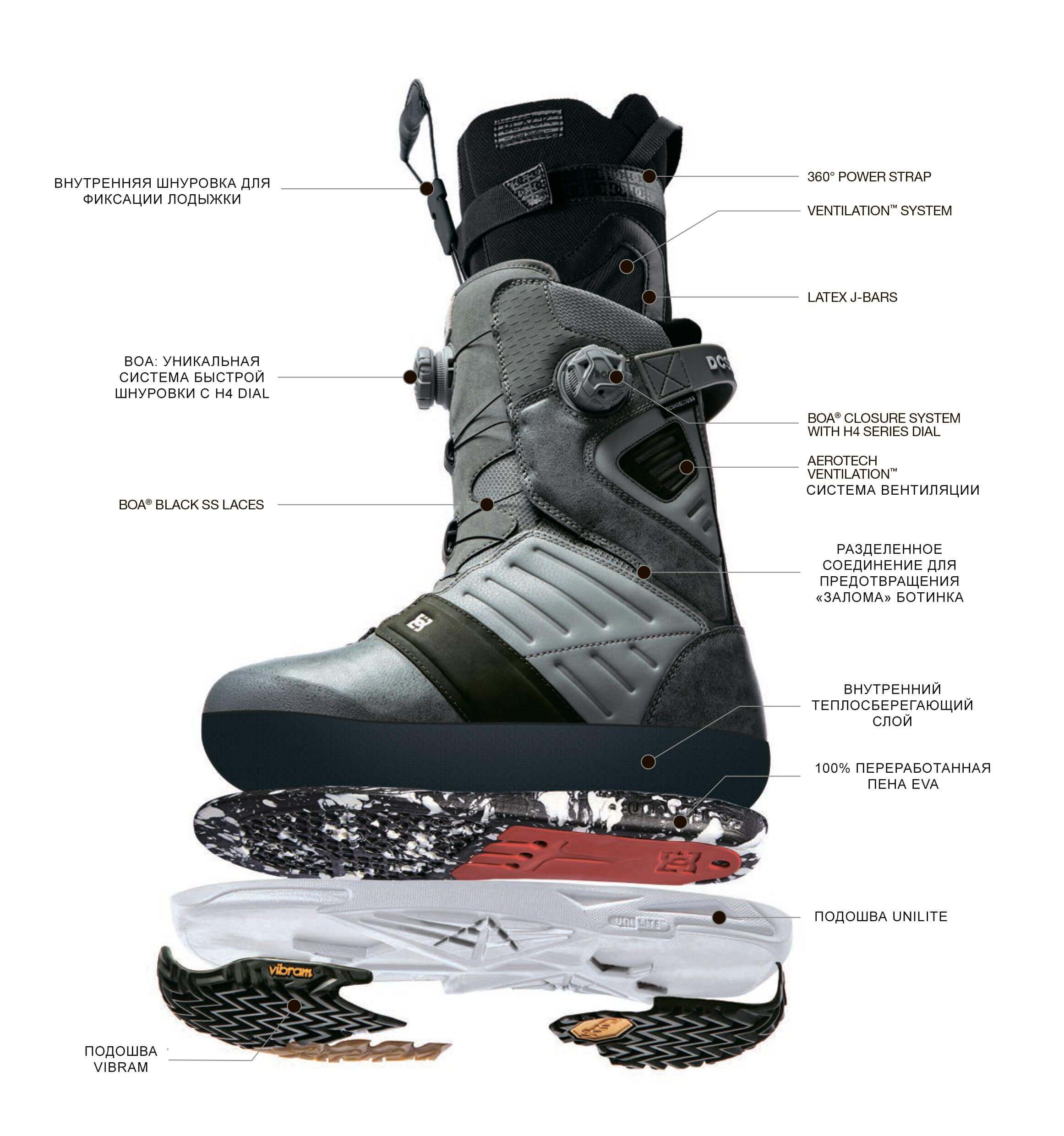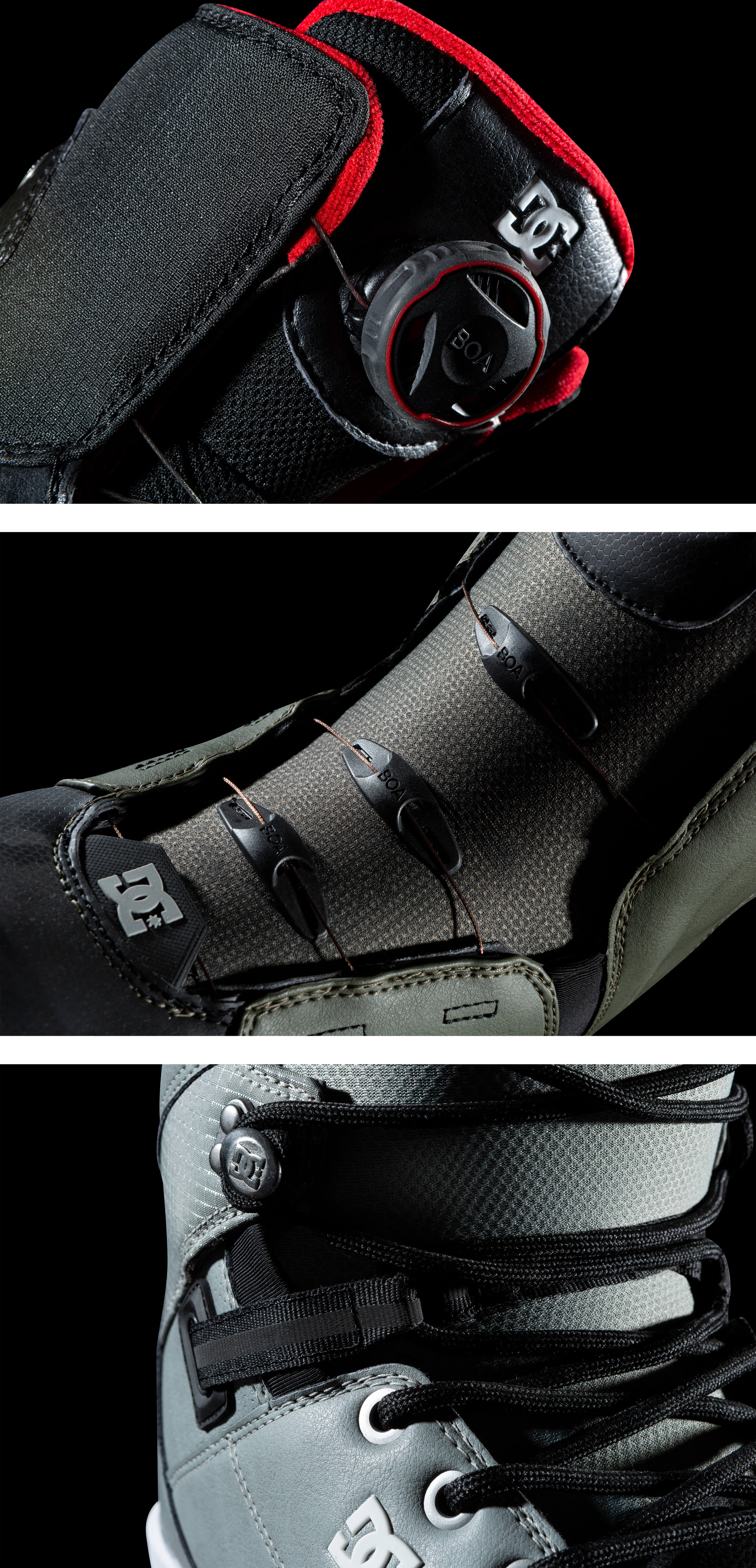 За фиксацию голеностопа и прилегание ботинок к ноге отвечает шнуровка. Сегодня распространены три ее вида: традиционная, быстрая и BOA. Традиционная шнуровка — это привычные всем с детства «технология» и алгоритм действий: вручную затягиваете шнурки и регулируете уровень комфорта и эффективность ботинка. Минус такой шнуровки — требуются определенные усилия, чтобы равномерно утянуть ботинок, ее ослабление в процессе катания, неудобство перешнуровки в перчатках или голыми руками на морозе.