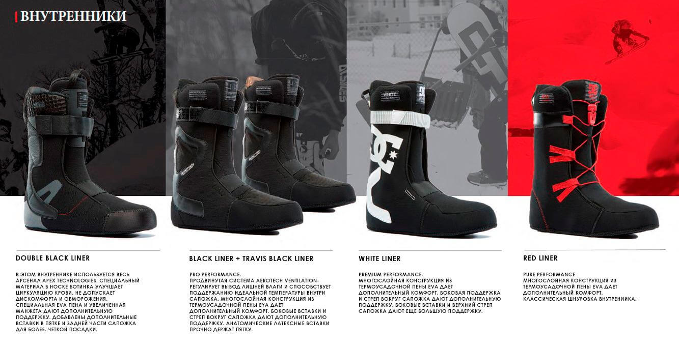 Внутренний сапожок в абсолютном большинстве моделей — съемный. Сделано это для того, чтобы его можно было вытащить для просушки или даже стирки. Изготавливается внутренник из мягкого вспененного материала. Основные его функции — комфорт, амортизация, утепление. Для лучшей фиксации и поддержки ноги в ботинке (а следовательно, и передачи усилий доске) некоторые модели и материалы внутренника предполагают термоформовку — при нагревании он становится гибким и мягким, а по мере остывания «запоминает» индивидуальную форму вашей ноги. Формовку делают в сервисных центрах, используя специальный фен или «печь».