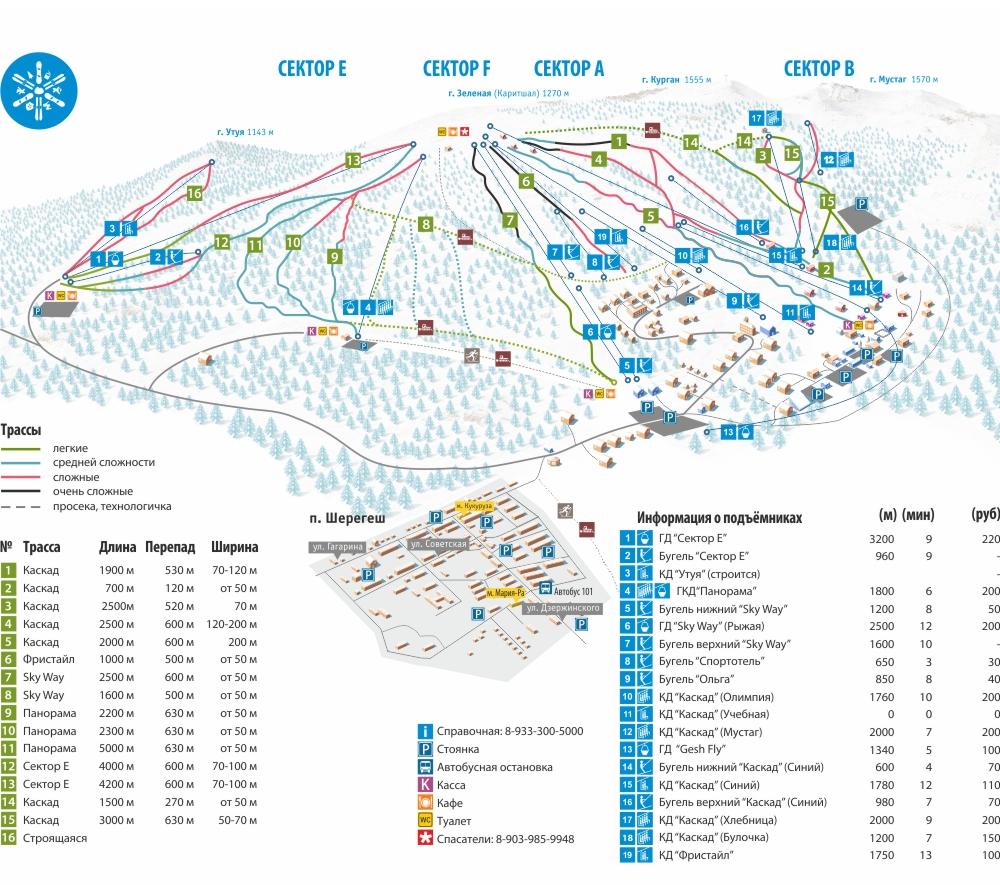 На курорте три уровня сложности трасс — синяя, зеленая и красная. Их общая протяженность 25 км.