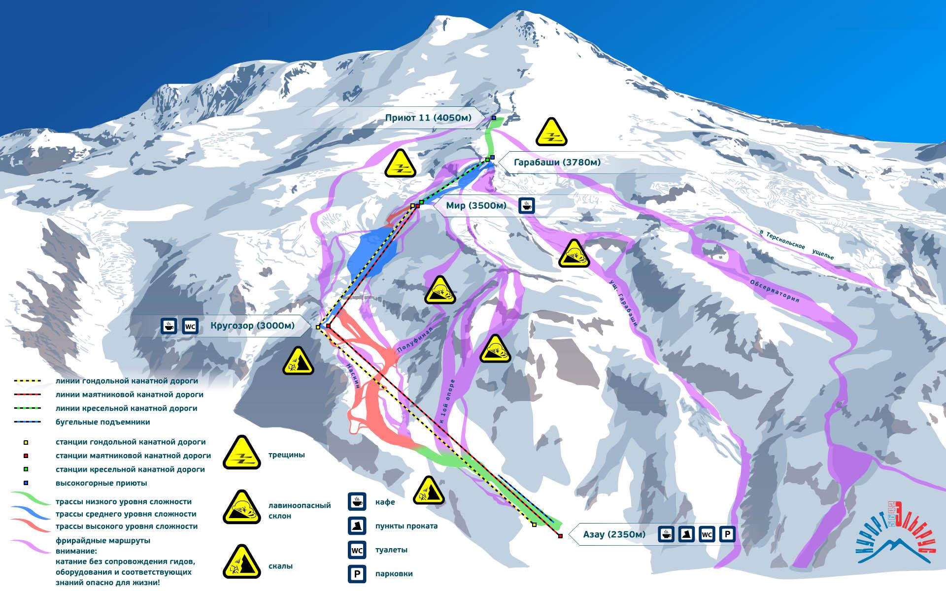 На склонах Эльбрусе нет большого разнообразия трасс — есть одна основная трасса с небольшими ответвлениями, общей протяжностью 13 км.