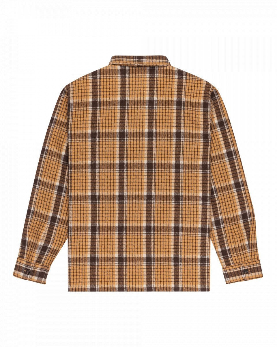 Шерстяная, колючая, теплая, ткань не толстая. На размер больше, чем рубашка от RVCA такого же размера. Карман на двух железных заклепках по краям. Качество хорошее