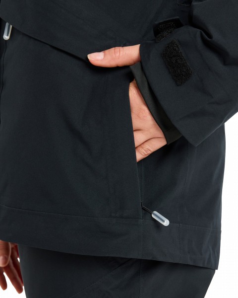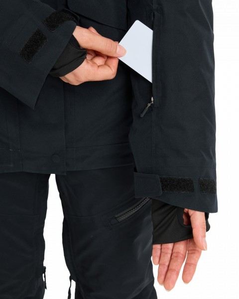 - Карманы: два кармана для рук с двойным входом на молнии, нагрудный карман с внутренним медиа-карманом и выходом для наушников, внутренний сетчатый карман для маски, карман для ски-пасса на рукаве
