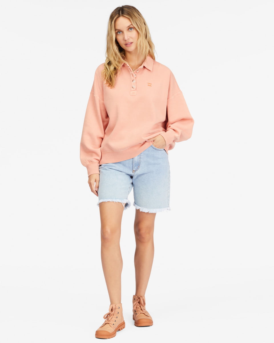 Свободный свитшот Lost Time представляет собой современный предмет гардероба, неуловимо напоминающий винтажную рубашку-регби. Надевается через голову, сделан из мягкого смесового хлопка и украшен манжетам и воротником в рубчик. А использование пигментных красителей придает ему неновый винтажный вид.